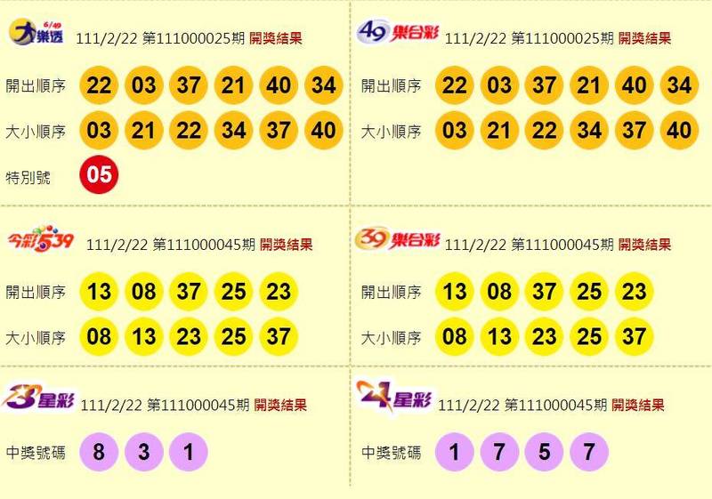 確切中獎號碼以台彩網站公告為主,請見「台灣彩券網站 」