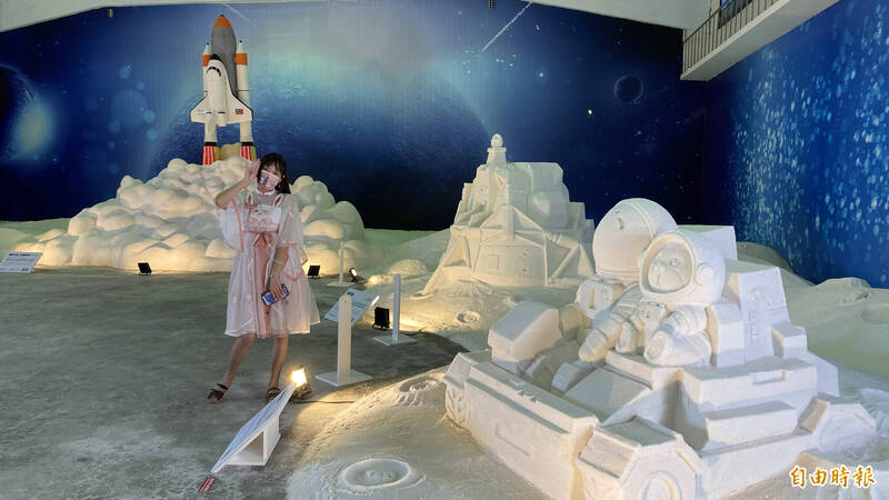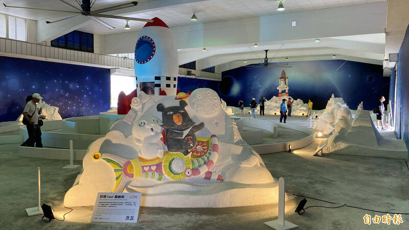 七股鹽雕展打造的12座「鹽宇宙」鹽雕,中間是座太空船大迷宮,搭配以雲嘉南特色景點如極西點國聖港燈塔、高跟鞋教堂及在地生態如黑面琵鷺等鹽雕作品,「好想兔」、「喔熊」也在作品中呈現歡樂氛圍。