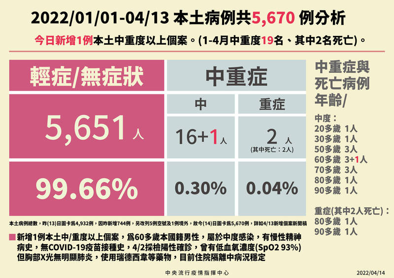 今天1月到4月中重度病患共19名,其中2名死亡。輕症、無症狀者多達5651人,占比為99.66%。