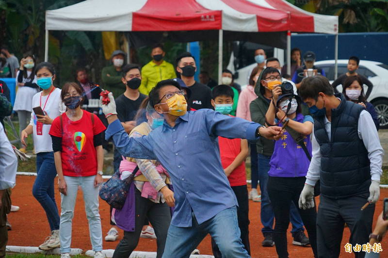 屏東縣政府今天舉辦六堆祈福尖炮城活動,潘孟安苦練8年終於丟進炮城。(記者陳彥廷攝)