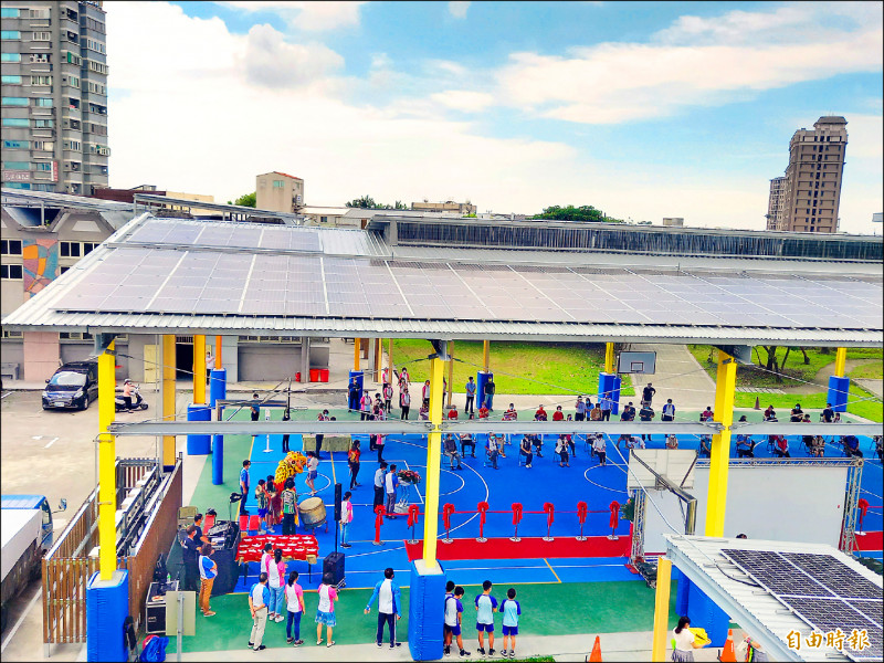 〔記者江志雄/宜蘭報導〕宜蘭縣五結鄉學進國小新建的太陽能光電球場昨天啟用,球場頂蓋有太陽能板集電,場區是雨天時的半戶外運動場所,成為學校及社區共同使用的多功能綜合場地。