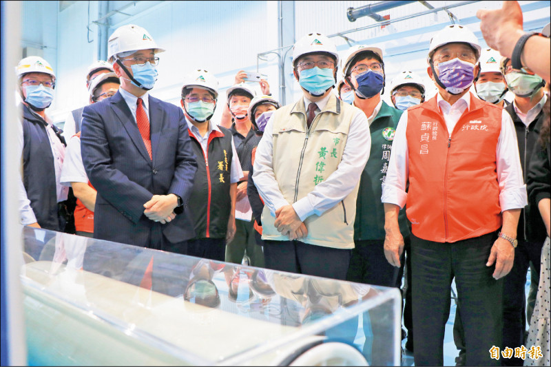 行政院長蘇貞昌(右)昨在市長黃偉哲(中)等人陪同下,前往永康水資源回收中心視察。(記者萬于甄攝)