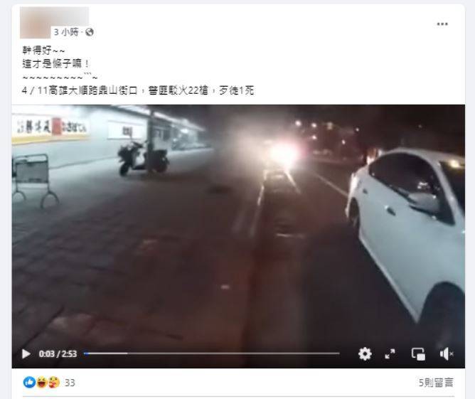台灣事實查核中心指出,近日於社群媒體及通訊軟體上流傳1段影片,搭配訊息指稱「4/11高雄大順路鼎山街口,警匪駁火22槍,歹徒1死」、「台灣媒體死光了,沒有一家報導,高雄治安好棒棒」等傳聞。