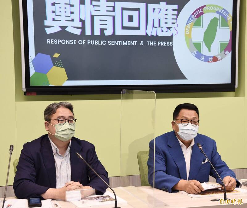 立法院民進黨團29日召開輿情回應記者會,立委陳歐珀(右)、黃世杰(左)出席。(記者塗建榮攝)