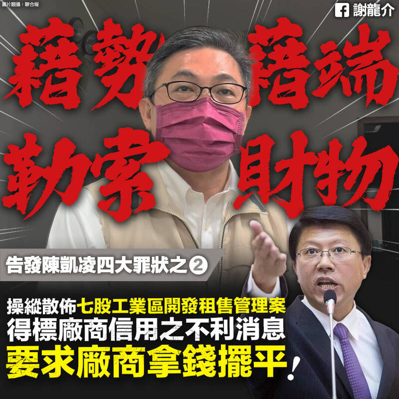 謝龍介提出包括,陳凱凌違法以公費租賃局長宿舍,強逼下屬簽辦,再由自己核准,涉嫌「圖利」。操縱散佈「七股工業區開發租售管理案」得標廠商信用之不利消息,要求廠商拿錢擺平,涉嫌「藉勢藉端勒索財物」。