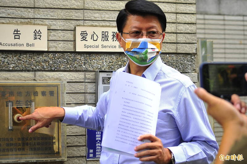 台南市議員謝龍介今日到台南地檢署按鈴控告經發局長陳凱凌涉嫌圖利、勒索。(記者王捷攝)