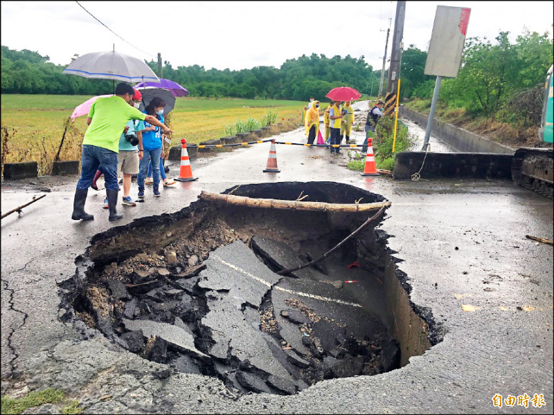 農田水利署雲林管理處指出,連續多日午後雷陣雨雨勢驚人,造成雲一八七線道路旁的茄苳腳圳幹線水位上升,塌陷路面旁的涵洞被樹枝、垃圾等雜物堵住,水流透過道路與圳溝銜接處滲流掏空路基造成塌陷。