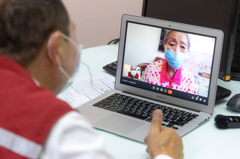 新北市長侯友宜與獨居在三重的80歲趙奶奶視訊,趙奶奶對到宅照顧隊的服務相當感謝。(新北市政府提供)