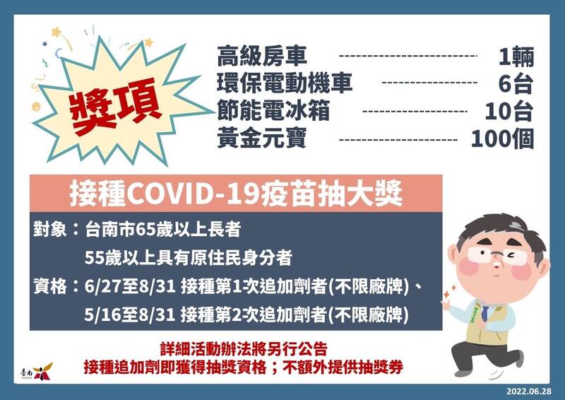 此外,7月31日前長者接種任1劑次COVID-19疫苗,還可領取快篩試劑2劑及500元以下禮券或禮品,65歲以上及55歲以上具原住民身分的民眾,可透過「台南打疫苗系統」 預約施打疫苗。