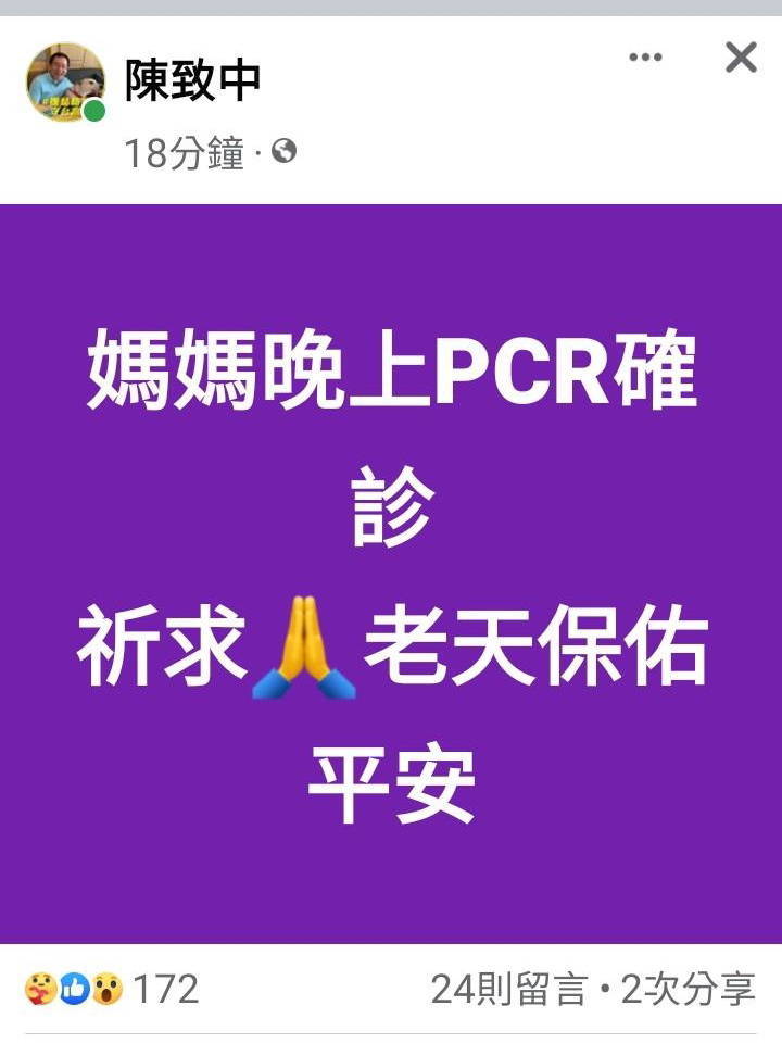 〔記者王榮祥/高雄報導〕前總統夫人吳淑珍今傳出PCR確診!高市議員陳致中證實今媽媽晚上PCR確診,有發燒、喉嚨痛等症況,因為媽媽身體本來就比較虛弱,讓他有些待新,請求老天保佑平安。