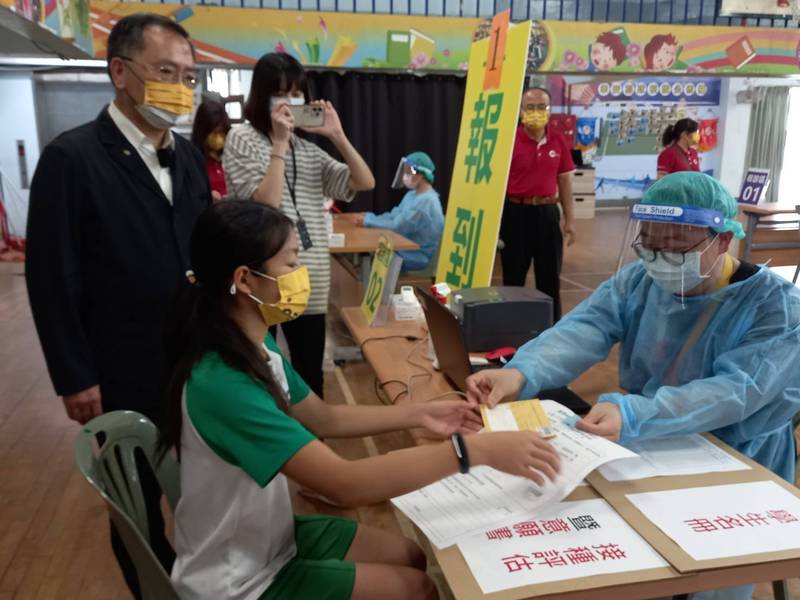 台北市幸安國小進行國小學童施打疫苗的模擬演練,台北市副市長蔡炳坤到場視察。(北市教育局提供)