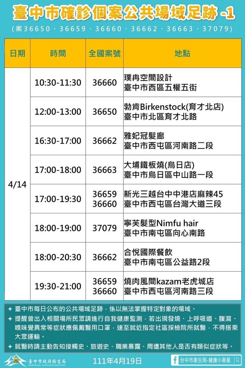 台中市府也公佈新增確診個案足跡,經疫調有4月14日西區璞冉空間設計、勃肯Birkenstock育才北店、西屯區雅妃冠髮廊、大埔鐵板燒烏日店、新光三越台中中港店麻辣45、南屯區寧芙髮型Nimfu hair、南屯區合悅國際餐飲、西屯區燒肉風間kazam老虎城店;4月15日清原芋園霧峰中正店、勃肯Birkenstock 台中逢甲店、家樂福超市台中大墩11店、南屯區艾美髮絲造型、北區森川丼丼梅亭橫町、輕井澤文心店。