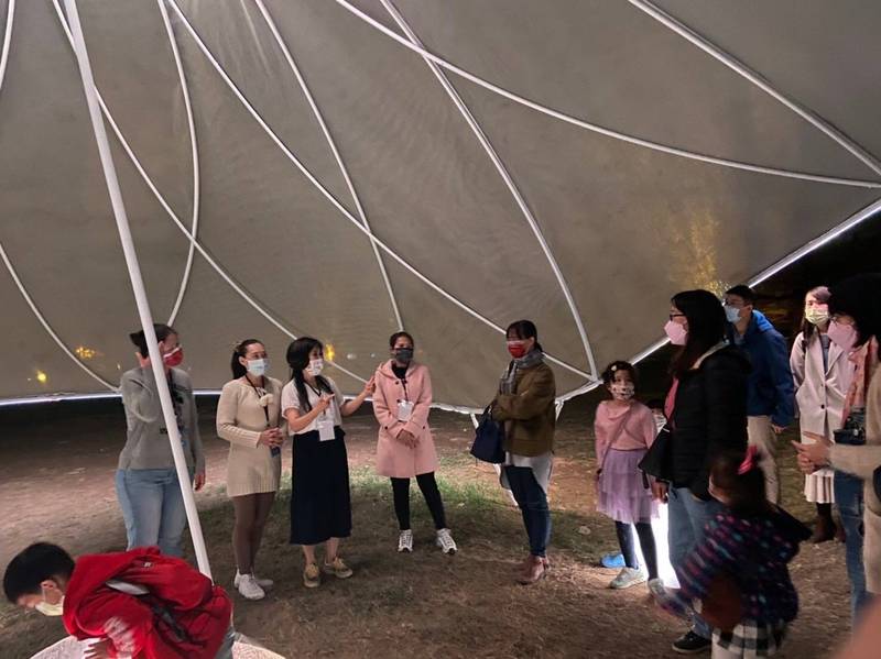 「2022台灣燈會-新住民燈區」二項作品「脈動」與「共生花」,由日本籍及加拿大籍新住民藝術家創作,座落於衛武營主場,每天有新住民通譯導覽人員,由越南新住民文創藝能協會理事長陳琳鳳領軍,以辦喜事心情,生動活潑方式,解說作品創作意涵。
