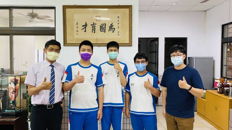 花蓮高中高二生王道一(中)取得奧林匹亞地科國手,與校長楊鵬耀(左起)及隊友王家恩、羅信安與指導教師侯統源合影。(圖由花蓮高中提供)