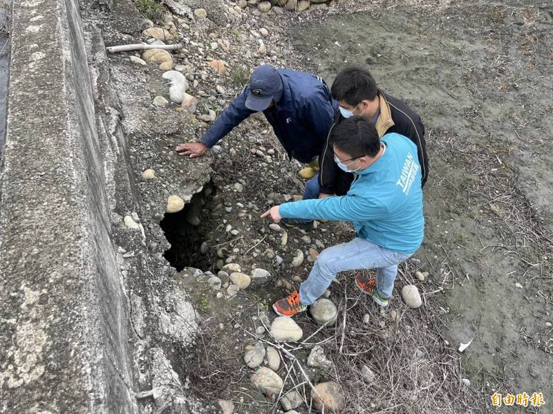 建興里里長蔡明河與當地居民於農曆年前即不斷反應,后厝溪橋旁六股排水支線的堤防遭掏空,出現超過一公尺深的大洞,深怕影響周遭農田與民眾安全,市議員施志昌日前辦理會勘,希望市府能儘速進行修復。