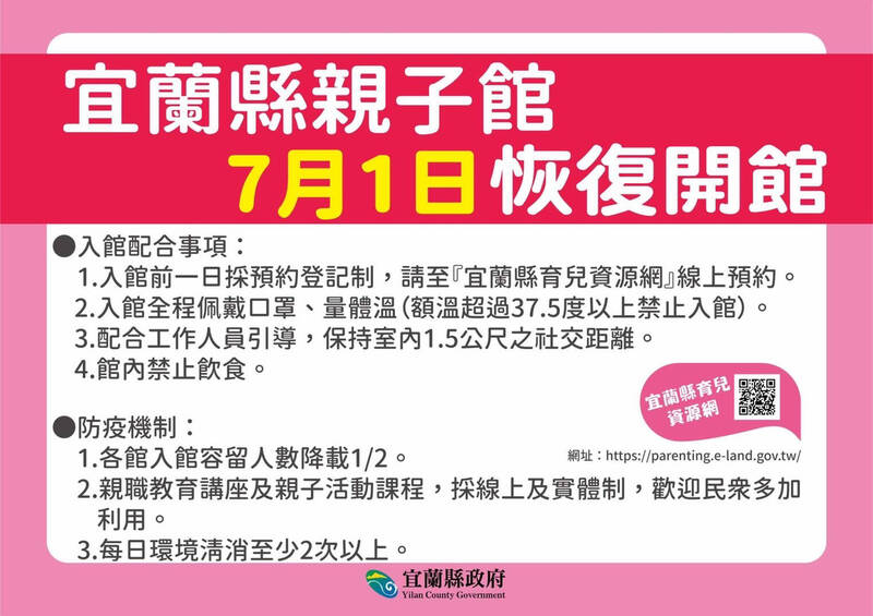 縣府表示,縣內親子館7月1日起重新開放入館,並採線上登記預約制,經量測體溫後才能進場;入內後需全程佩戴口罩,並保持安全社交距離。