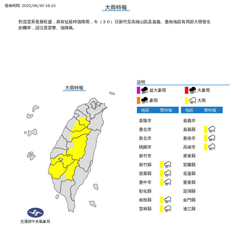 氣象局下午4點15分發布大雨特報指出,因為對流雲系發展旺盛,易有短延時強降雨,新竹以南山區及嘉義、台南地區有局部大雨發生的機率,請注意雷擊、強陣風;警戒範圍包含:新竹縣、苗栗縣、台中市、南投縣、雲林縣、高雄市山區,以及嘉義縣、台南市。