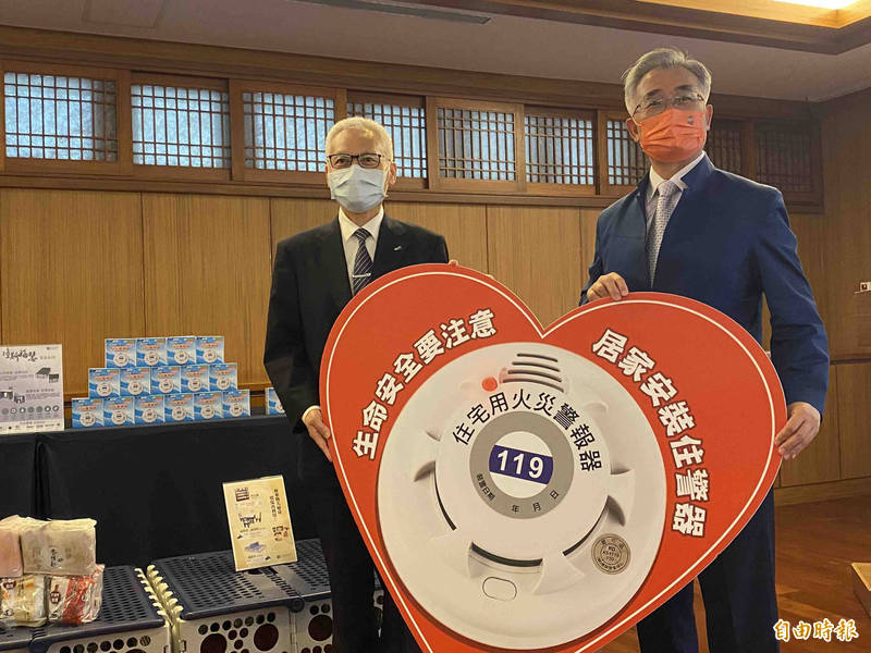 慈濟慈善基金會副執行長張濟舵(左),捐贈住警器給高雄市消防局代理局長王志平。(記者黃旭磊攝)