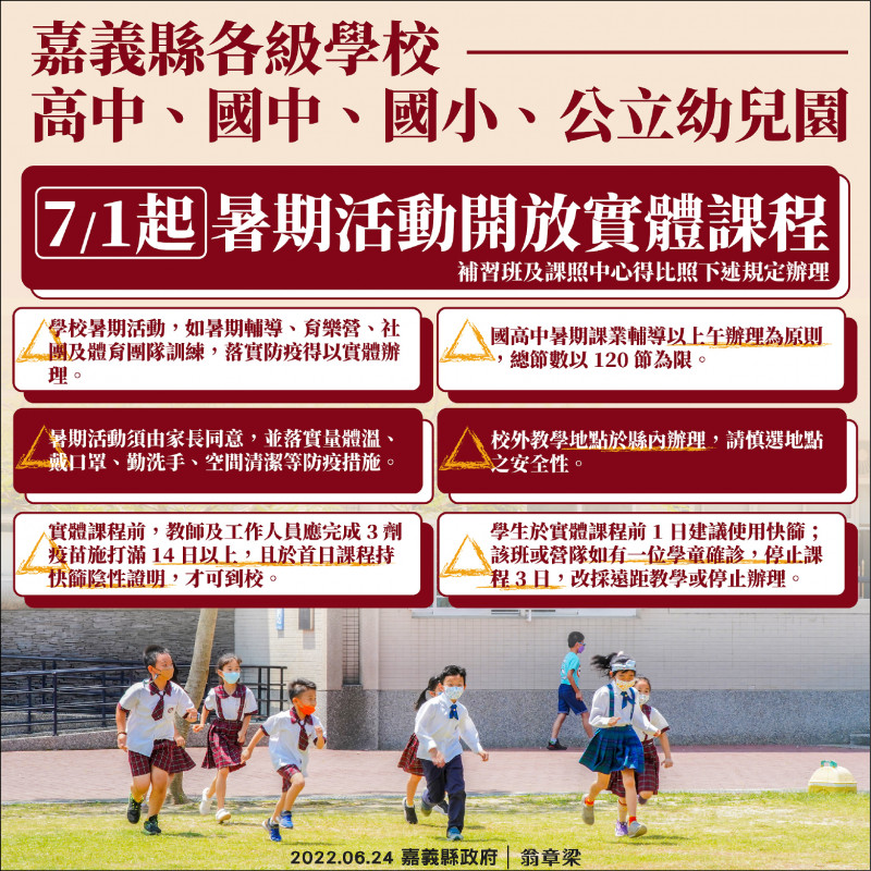 〔記者王善嬿/嘉義報導〕疫情趨緩,嘉義縣考量暑假學生學習需求,宣布七月一日起,在各校嚴格遵守防疫指引前提下,可以實體方式辦理暑期輔導、育樂營、社團、體育訓練等暑期活動;嘉市國中小也在防疫指引下,可因應不同活動種類、性質,同時推出線上與實體課程,兼顧防疫與學習。