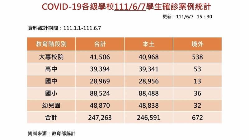 境外移入672名確診學生,比昨日增加4人,其中538人是大專生,高中生53人,國中生13人,國小生36人(增加2人),幼兒園32人(增加2人)。
