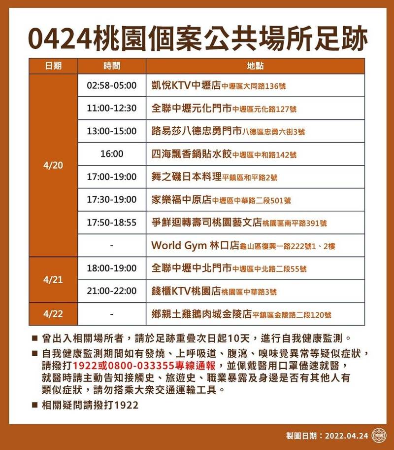 4月20日則有中壢區大同路凱悅KTV、全聯中壢元化門市、路易莎八德忠勇門市、中壢區中和路四海飄香鍋貼水餃、平鎮區和平路舞之磯日本料理、家樂福中原店、爭鮮迴轉壽司桃園藝文店、World Gym林口店;4月21日有全聯中壢中北門市、錢櫃KTV桃園店;4月22日平鎮區金陵路二段鄉親土雞鵝肉城金陵店等地。