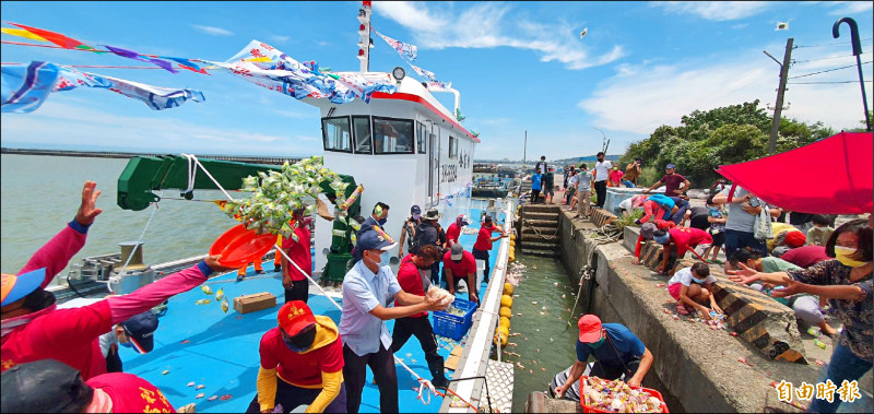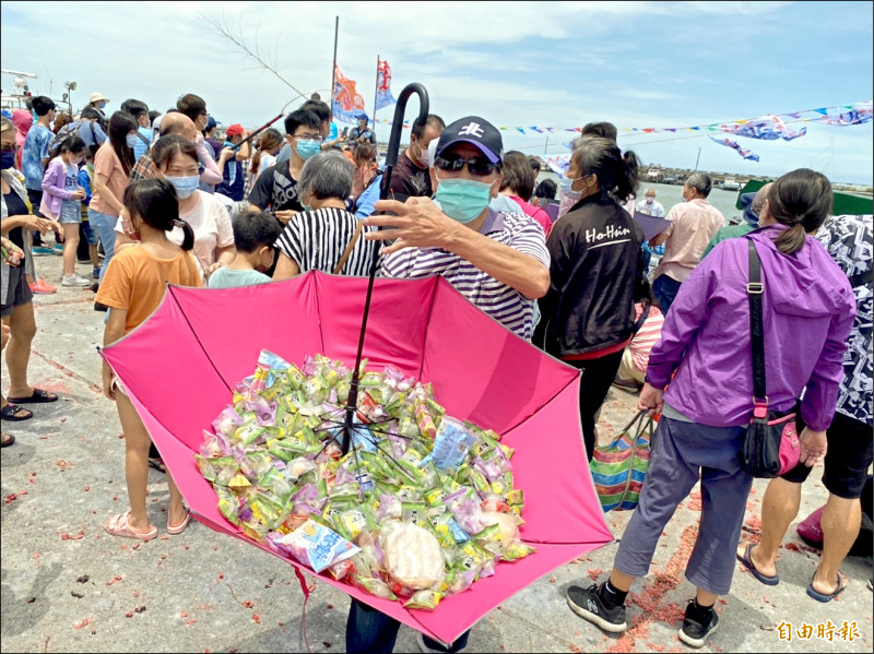 〔記者蔡彰盛/竹市報導〕哇!竟然有包子、麻糬跟糖果從天而降!昨天中午有漁民首次在新竹市海山漁港,沿用古禮擲吉麻糬(撒麻糬)祈福舉行新船下水儀式,船主準備了豐富的麻糬五百斤、包子八百顆及數十斤糖果,與民眾分享一起沾添喜氣,並祈求滿載豐收、人船平安。當地民眾扶老攜幼,拿著雨傘、籃子在岸邊接麻糬、糖果等大豐收,現場熱鬧非凡。