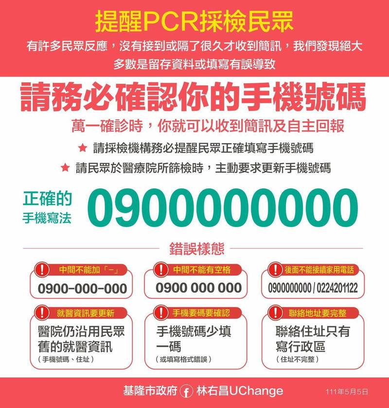 〔記者盧賢秀/基隆報導〕近來有很多民眾反映,確診或居家隔離沒有接到電子確診通知書或簡訊,或是過了很久才收到,有人收到有人沒收到簡訊等問題,基隆市長林右昌說,市府發現有很高比例的電話是錯的,或留的是市話,他提醒民眾採檢時務必確認填寫手機號碼是正確的。