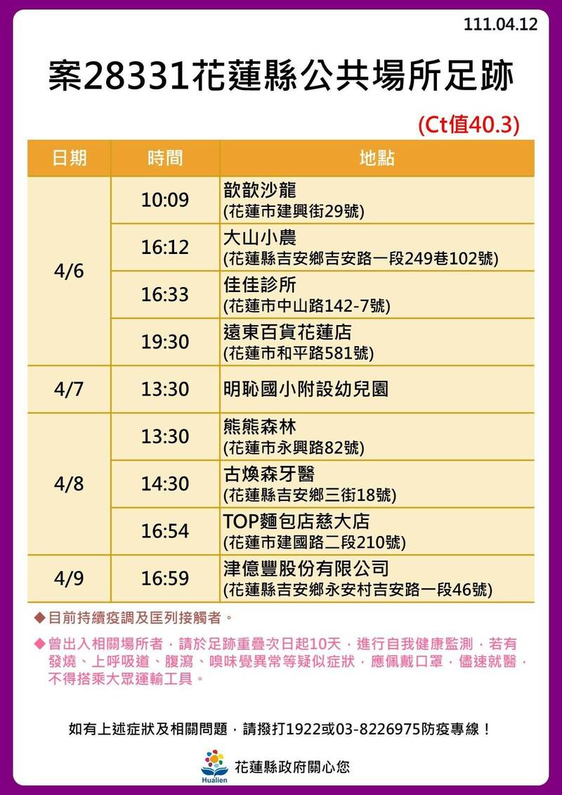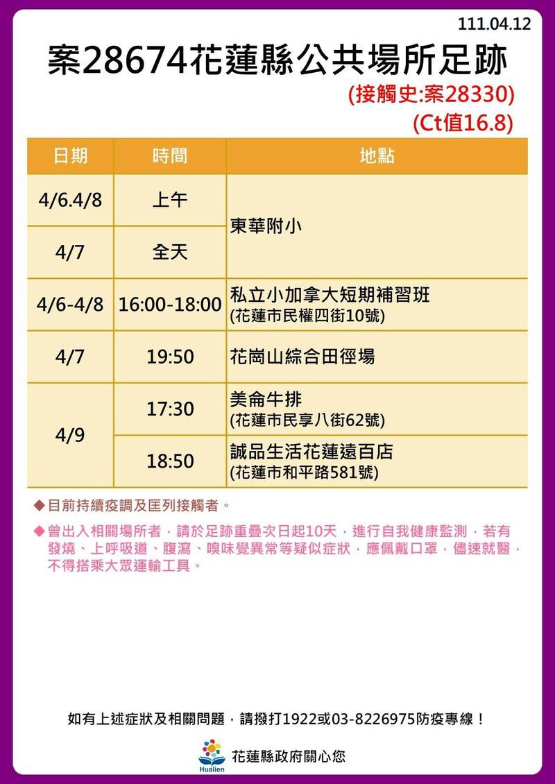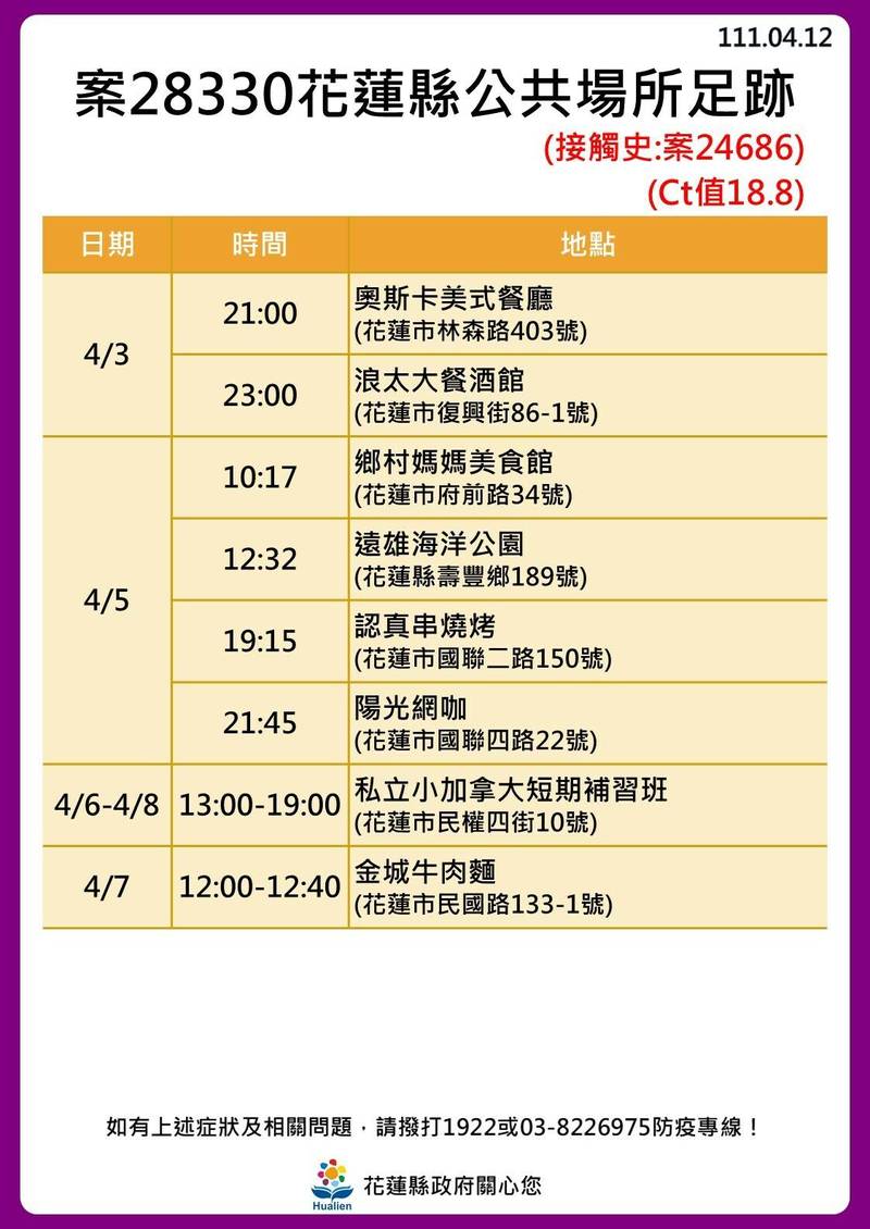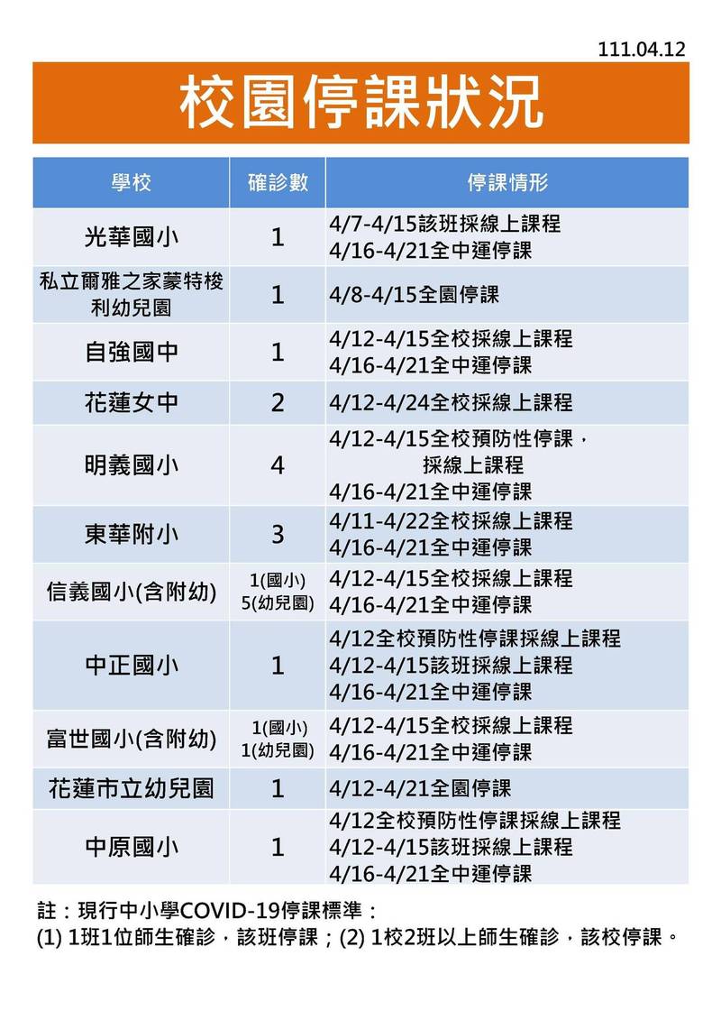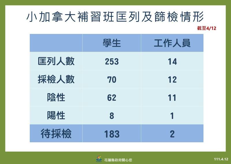 花蓮小加拿大美語補習班今天群聚新增7人,包括5名學生案28674(東華附小,10歲)、案28327(東華附小,11歲)、案28332(信義國小附幼,6歲)、案28677(花蓮市幼,5歲)及案28326(信義國小附幼,7歲),家長2人案28329(案27876的媽媽)、案28324(案28327的爸爸)。