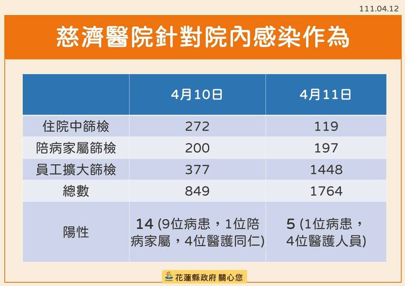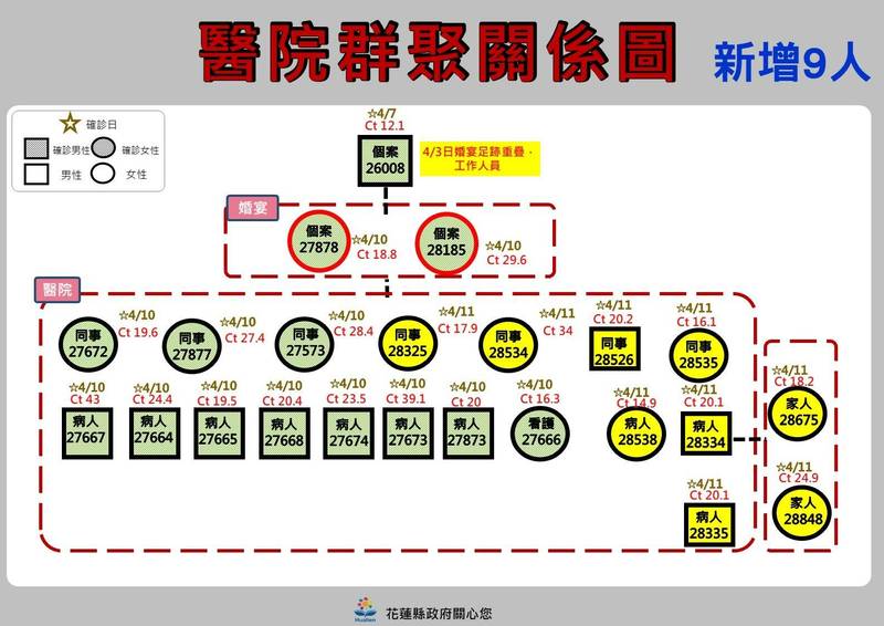 慈濟醫院群聚今天新增9人,除了28歲外科住院醫師案28526、50歲護理師案28325、24歲病房護理師28534、在醫院負責檔案傳送的65歲男案28535等4名醫院人員,也追回已出院的3人回到醫院檢查,包括49歲女案28538(住在中區鄉鎮)、23歲男案28335、43歲男案28334。其中案28334因電話未開機,疫調人員找不到人鬧失蹤,衛生局找警方協尋,後來是在山上找到人。
