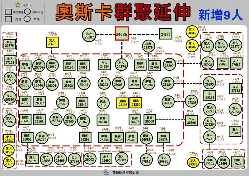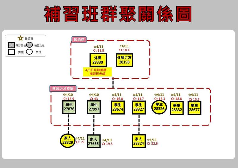 衛生局長朱家祥說,美語補習班感染源來自29歲美語外籍老師案28330,他與3日晚上一同去奧斯卡美式餐廳的21歲男案28198是好朋友,2人案號都是今天公布,屬於奧斯卡群聚的感染鏈。
