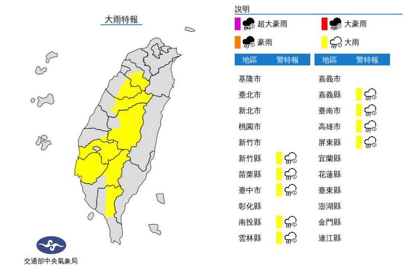 氣象局表示,對流雲系發展旺盛,易有短延時強降雨,今(30日)新竹以南山區及嘉義、臺南地區有局部大雨發生的機率,請注意雷擊、強陣風;警戒範圍包含:新竹縣、苗栗縣、台中市、南投縣、雲林縣、高雄市、屏東縣山區,以及嘉義縣、台南市。