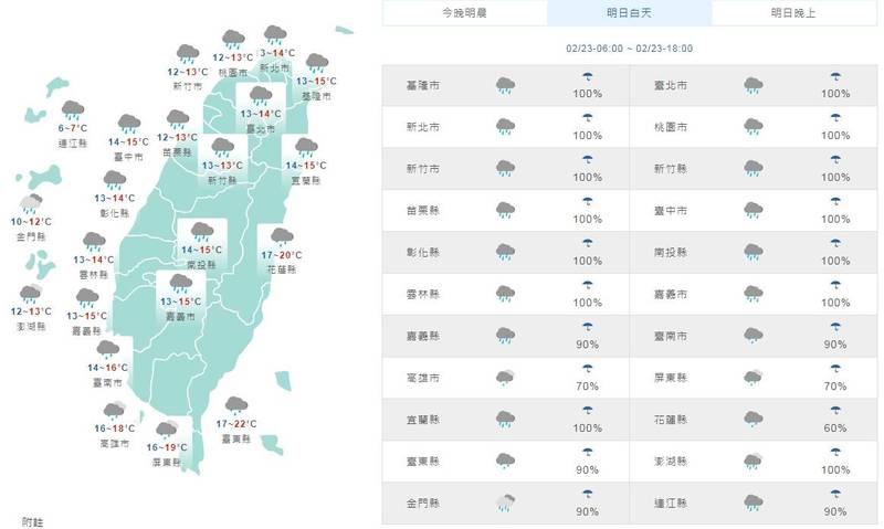 明天中部以北及宜蘭整日溫度變化不大,落在13至15度之間,而南部及花東為16至19度,配合降雨體感溫度較低,感受仍偏冷,提醒民眾務必要做好保暖。(圖擷取自中央氣象局)