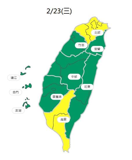〔即時新聞/綜合報導〕明(23)日水氣再度增加,中部以北及東北部地區降雨仍較持續,花東降雨較短暫,偶爾會有空檔出現;南部地區則大多為多雲,只有局部地區有零星降雨。不過中部以北、東北部、東南部地區有局部大雨發生的機率,提醒民眾外出記得攜帶雨具。