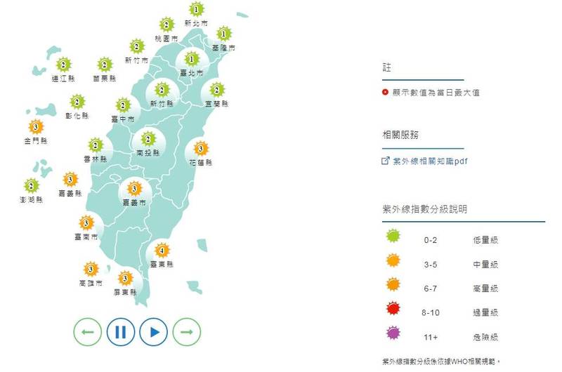 紫外線指數方面,明天除花蓮縣、台東縣、嘉義市、屏東縣、嘉義縣、台南市、高雄市、金門縣為中量級外,其餘均為低量級。