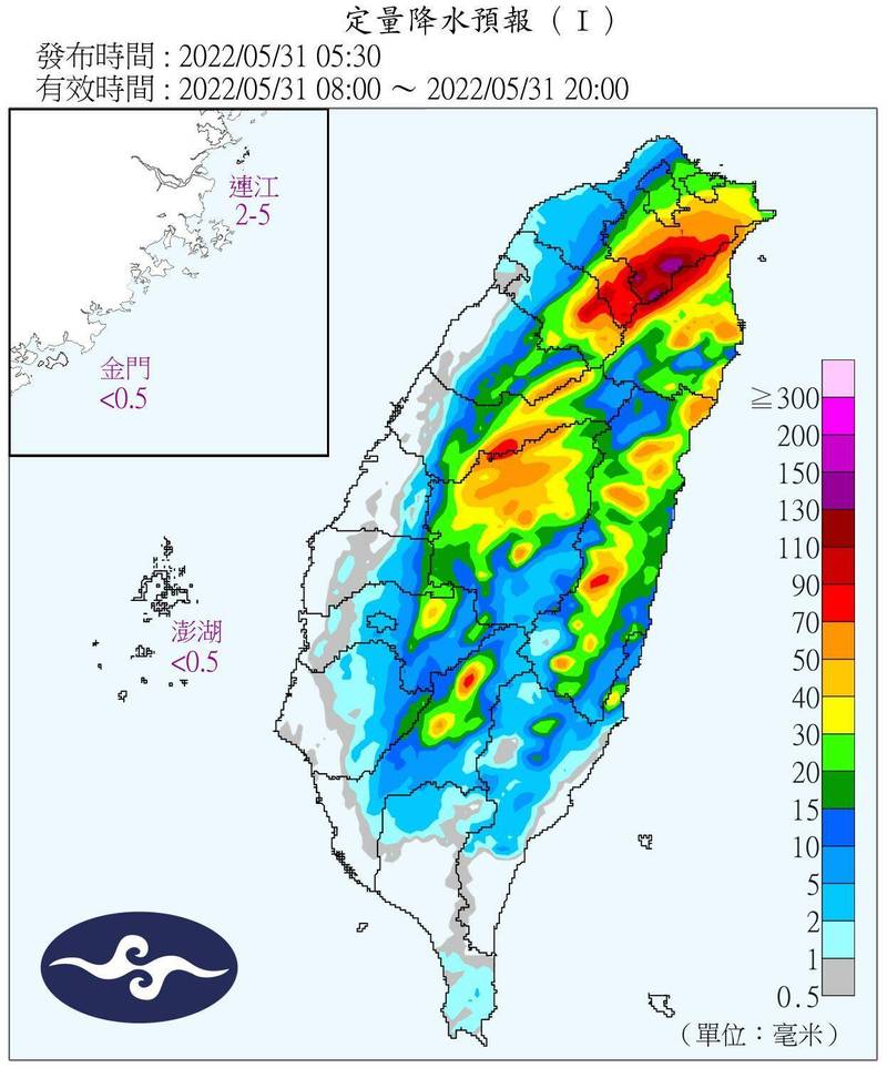 中央氣象局預報員張承傳說,西半部、基隆北海岸上午仍有局部短暫陣雨或雷雨,午後雨勢和雨區擴大,各地容易有局部短暫雷陣雨以及短延時強降雨,其中大台北地區須留意局部大雨或者豪雨,全台山區、宜蘭地區須留意局部大雨。