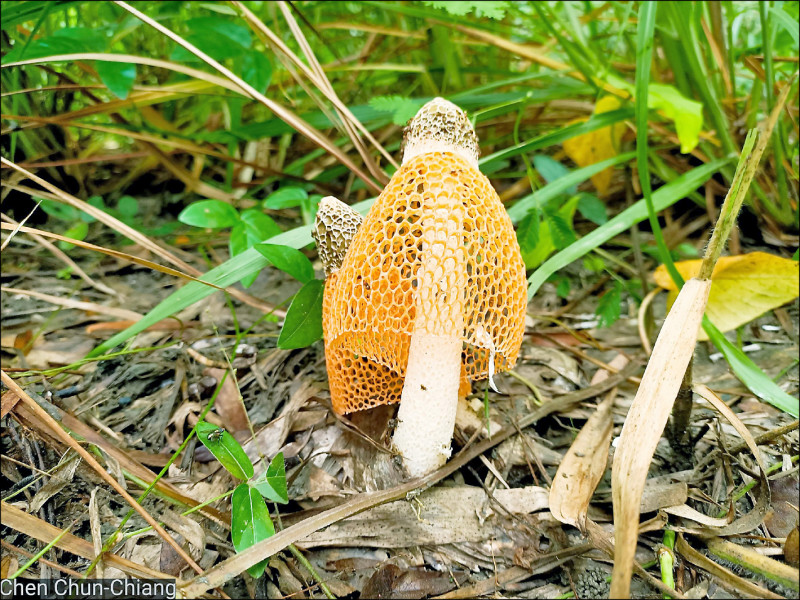 日前高雄地區連日雨勢後,鳳山水庫溢洪道附近出現小族群黃裙竹笙,黃色網狀菌幕遮蓋住菌柄,精緻的菌幕在荒煙漫草中更顯奪目。
