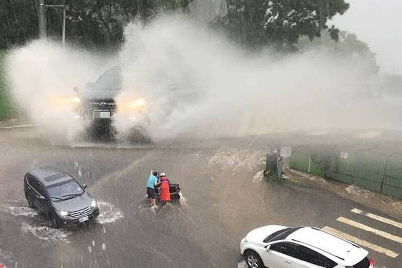 大雨狂炸三義木雕街,馬路成為河流,機車騎士因「水勢湍急」無法前進,行經的汽車「乘風破浪」激起巨大水花。 (民眾提供;本報合成)