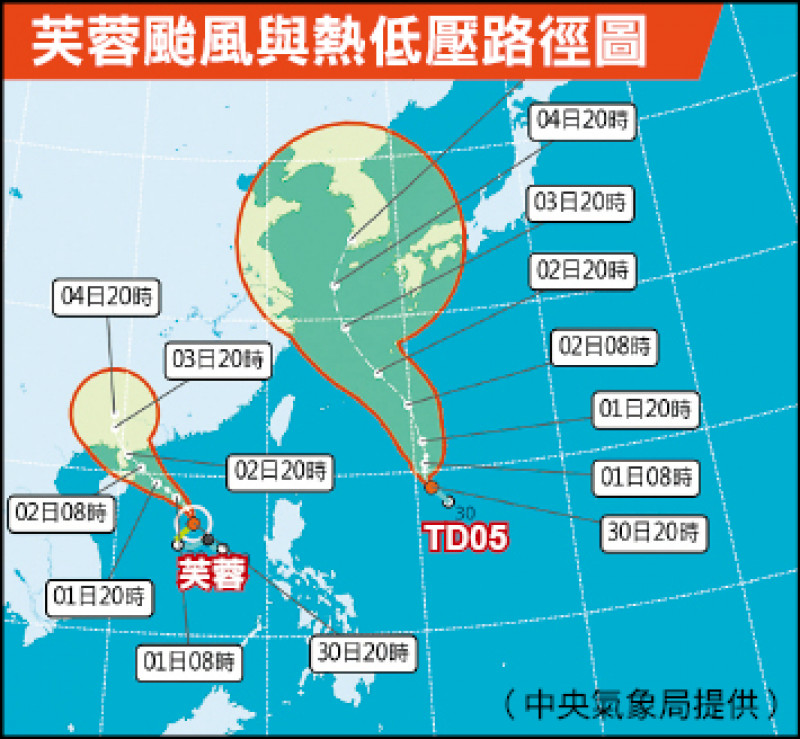 〔記者陳心瑜/台北報導〕今年颱風季首颱芙蓉(Chaba)昨上午八點生成,還有一個熱帶性低氣壓TD○五估最快今上午會增強為艾利(Aere)颱風,氣象局預估,上述兩者直接侵台機率低,但將接力影響天氣,即日起未來一週全台易有雨,南部、東部地區未來一週整天有雨且須留意局部大雨,北部、東北部則是午後雷陣雨為主。