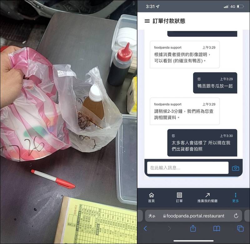 有網友近日在臉書社團「外送員的奇聞怪事」發文,表示又遇到一名客人想騙餐,根據她PO出的畫面顯示,該名顧客向外送平台反映餐點缺了「鴨舌」,但她也立刻回應表示出貨前都有拍照存證,並向客服強調「鴨舌」就和冬瓜放在一起,她也藉機向客服訴苦「太多客人會這樣了,所以現在我們出貨都會拍照」。