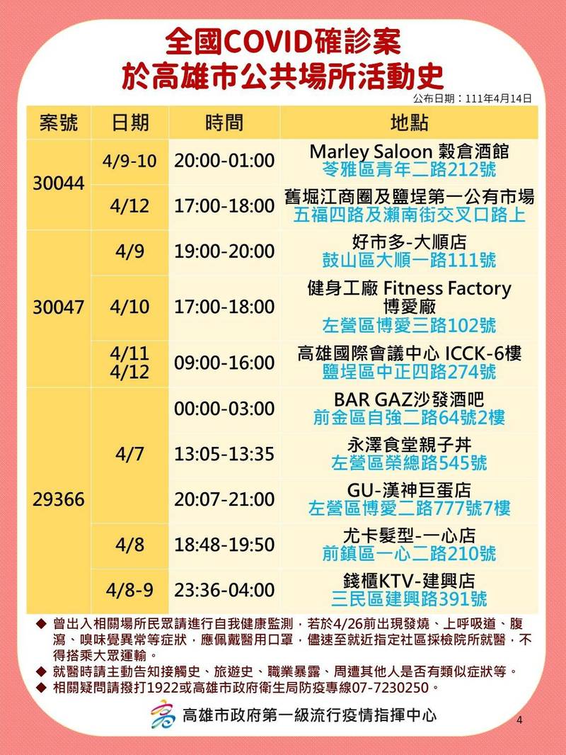 還有高雄國際會議中心ICCK6樓、好市多大順店等;環保局加強47處確診足跡點周邊50公尺,進行戶外公共場所環境清潔、消毒。