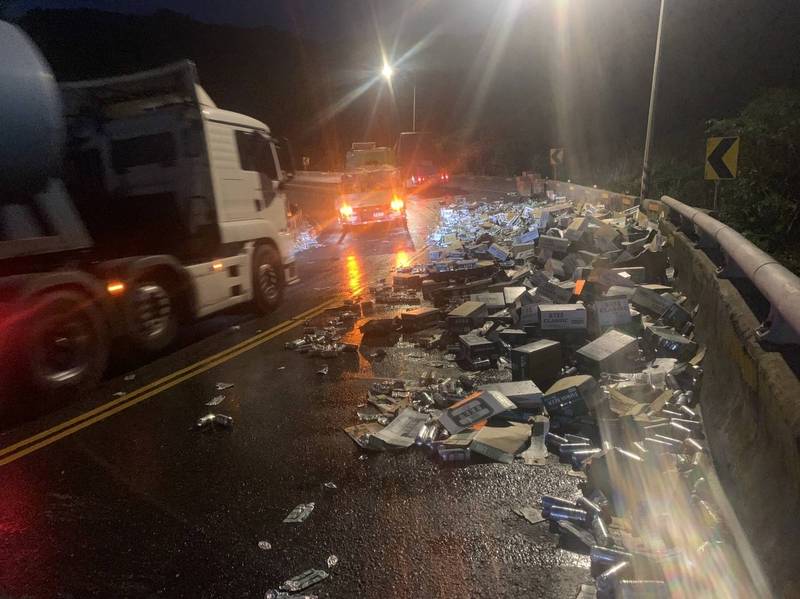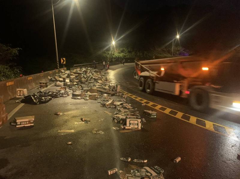 60歲蔡姓司機開著附掛子車的貨車,沿北部濱海公路台2線由基隆開往宜蘭,今天傍晚6點左右行經新北市貢寮區台2線86.5K處大彎道,後拖子車上一箱箱易開罐啤酒疑未固定好,數千罐啤酒甩落路面,佔據對向車道,影響通行。