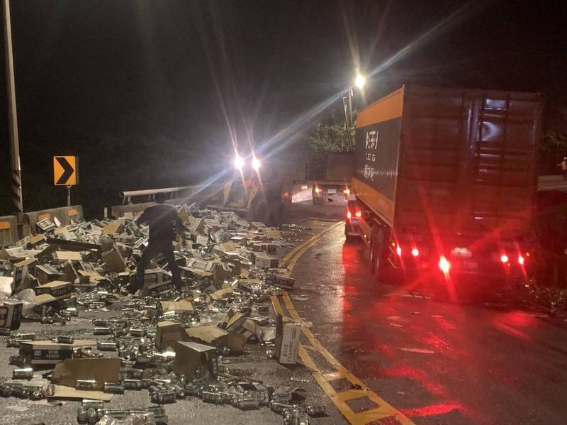 由於掉落路面的啤酒太多,佔據一個車道,貨運公司人員還在清運中;瑞芳警方通報交大路況中心及警廣電台,提醒用路人行經時減速慢行。