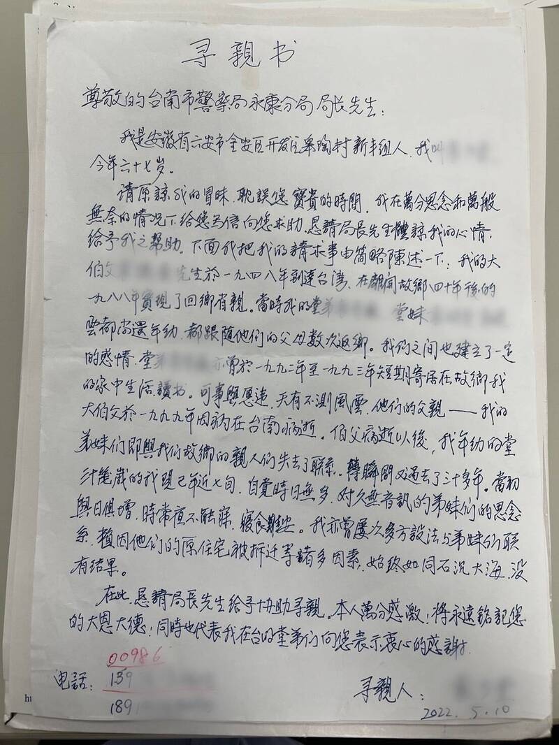 台南市永康警分局6月初收到一份一封來自中國安徽省尋親書,希望警方幫忙找尋失聯多年的堂弟一家人。(警方提供)