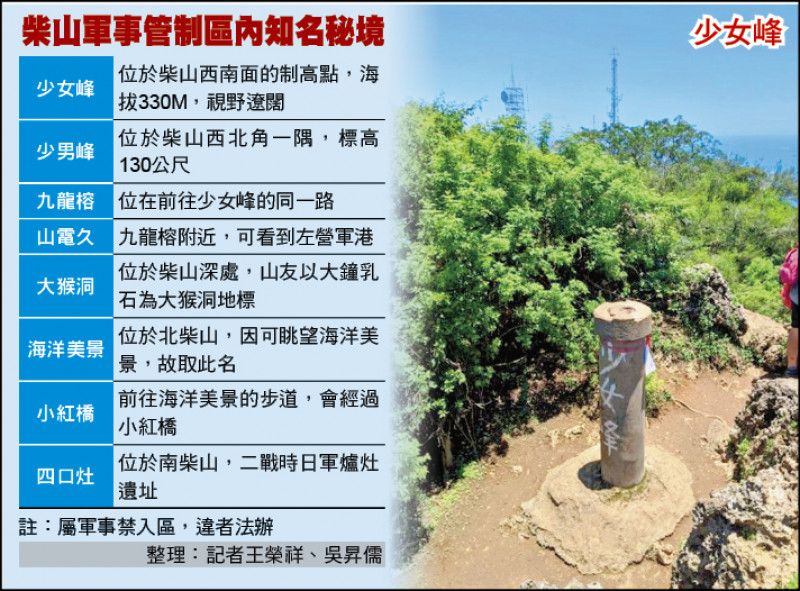 〔記者王榮祥、吳昇儒/綜合報導〕位於高雄的壽山國家自然公園面積約一千一百餘公頃,其中逾半、約六百公頃為軍事管制區,不少「秘境」都在管制內;儘管軍方已設置標示提醒,卻始終擋不住愛冒險的山友,不時傳出誤闖甚至迷途事件。