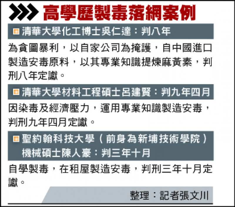 〔記者王定傳/台北報導〕檢警偵辦成功大學化工博士、前中央研究院基因體中心博士後研究張恩銘涉嫌製毒,發現他僅為了四十萬元借款,以及每次檢驗毒品純度、品質的三千元至一萬元報酬,鋌而走險犯案,不僅自身學術清譽染上汙點,且涉犯可處七年以上徒刑、得併科一千萬元以下罰金的製造第三級毒品罪,可說是得不償失。