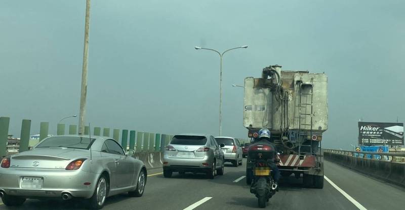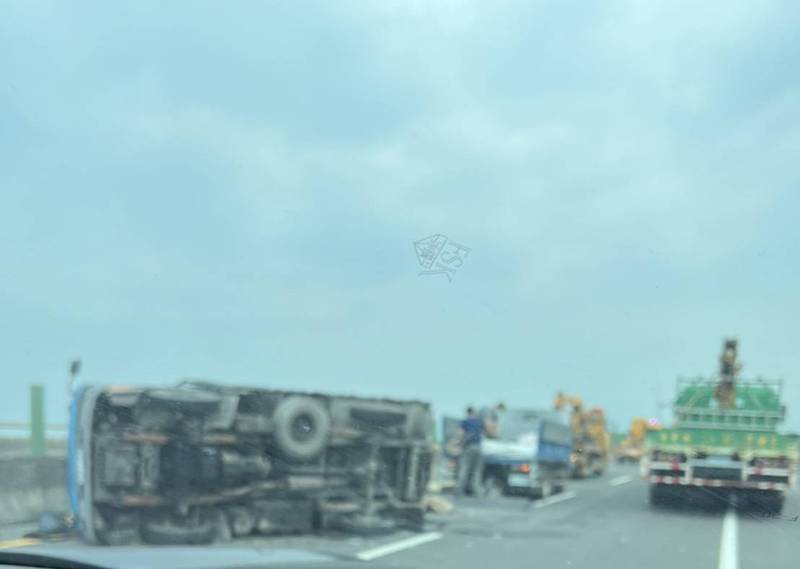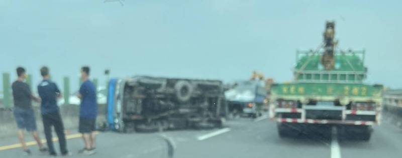 今天下午約2點左右,有用路人從高雄返回屏東方向,行經約13.5k處時,發現內側車道竟有1輛貨車傾覆,車身整個就橫亙於內側車道上,後方車輛見狀,趕緊切至外側車道,險象環生。